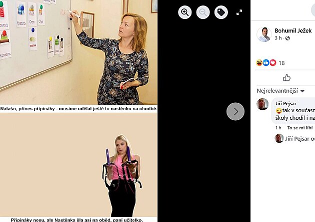 Vtip zobrazuje učitelku před tabulí, která říká další ženě (Nataše), aby přinesla připínáky, že „musí ještě udělat nastěnku na chodbě“. Druhá žena přináší dvě sexuální pomůcky a říká: „Připínáky nesu, ale Nastěnka šla asi na oběd, paní učitelko“. Kvůli použitým jménům tak zároveň může působit jako protiukrajinský.