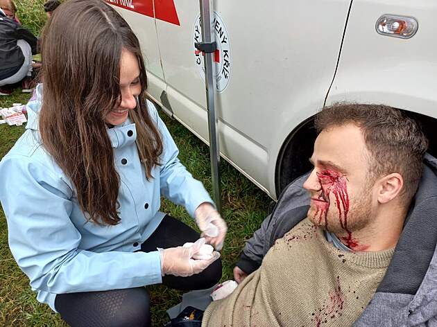Organizátoři připravili pro vysokoškoláky v Boleticích několik stanovišť. Na tomto cvičili první pomoc u dopravní nehody.