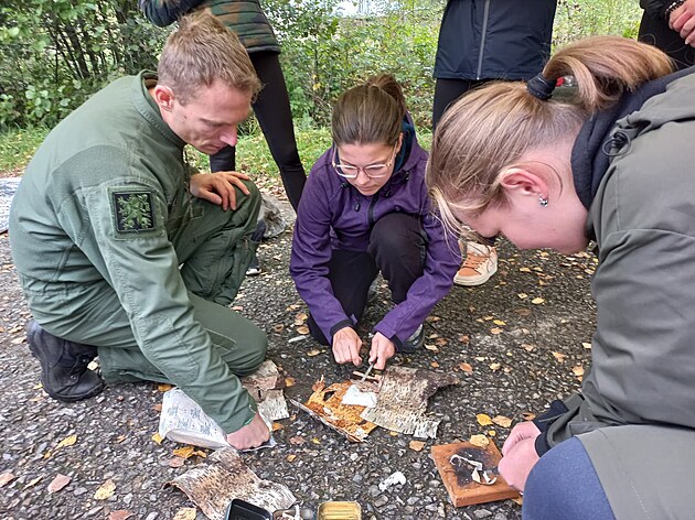 Organizátoři připravili pro vysokoškoláky v Boleticích několik stanovišť. Na tomto zkoušeli rozdělat oheň pomocí křesadla.