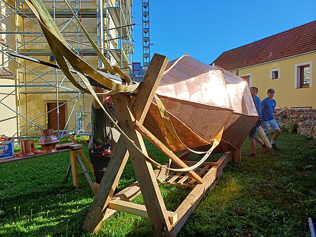 V Ledenicích opravují věž kostela. (22. července 2025)