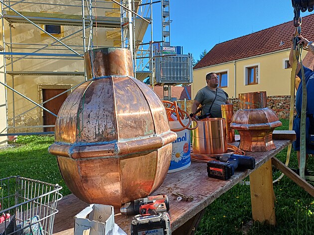 V Ledenicích opravují věž kostela. (22. července 2025)