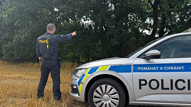 Policisté hlídkují kolem lesa, kam býk utekl a pátrají po něm pomocí dronů.