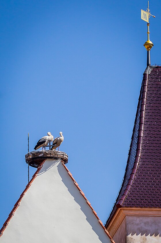 Čápi se na hnízdo umístěné na střechu kostela v Dubném pravidelně vracejí. (rok 2020)