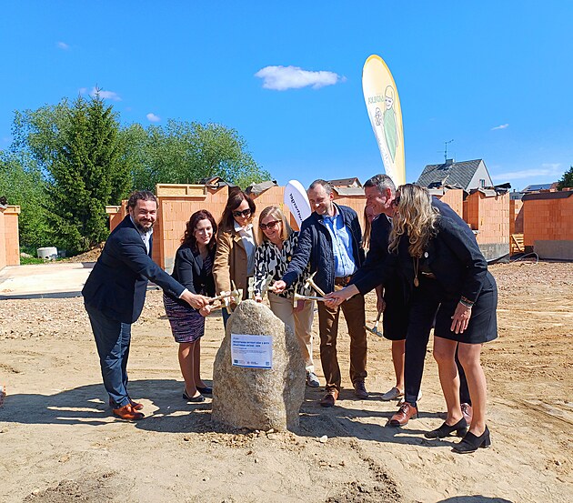 Symbolického poklepání na základní kámen se ujal například architekt Jan Klein (vlevo), primátorka Českých Budějovic Dagmar Škodová parmová (druhá zleva) či ředitelka a zakladatelka Centra Bazalka Vanda Polívková (čtvrtá zleva).