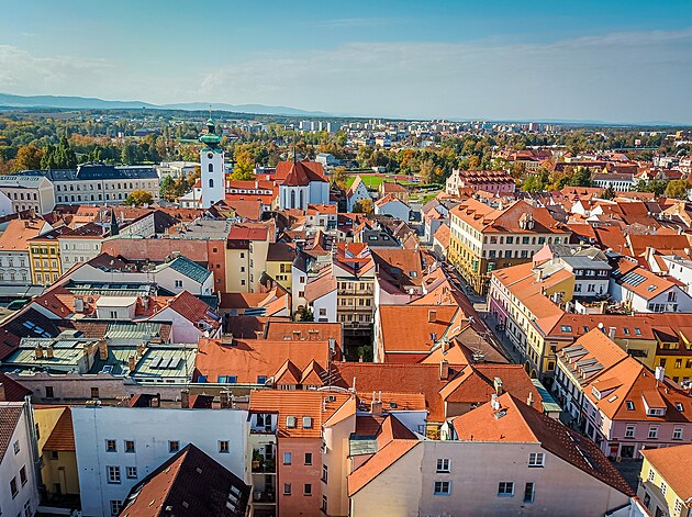 Pohled z Černé věže západním směrem. Skoro uprostřed je kostel Obětování P. Marie, Bílá věž a část bývalého dominikánského kláštera. Tady v této oblasti se po založení města po roce 1265 začalo ihned stavět.