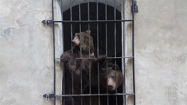 Medvědí sourozenci čekají na vypuštění do krumlovského zámeckého příkopu.