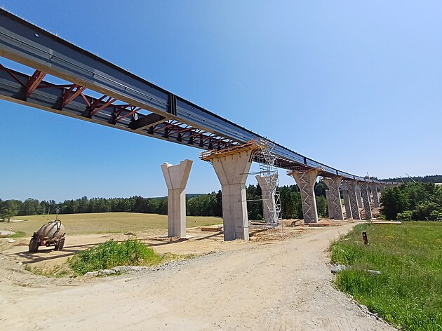 Ocelovou konstrukci estakády na dálnici D3 svařují na místě a postupně ji vysouvají přes betonové pilíře.