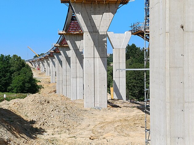 Ocelovou konstrukci estakády na dálnici D3 svařují na místě a postupně ji vysouvají přes betonové pilíře.