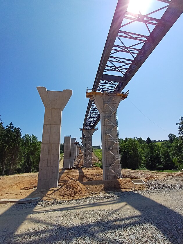 Ocelovou konstrukci estakády na dálnici D3 svařují na místě a postupně ji vysouvají přes betonové pilíře.
