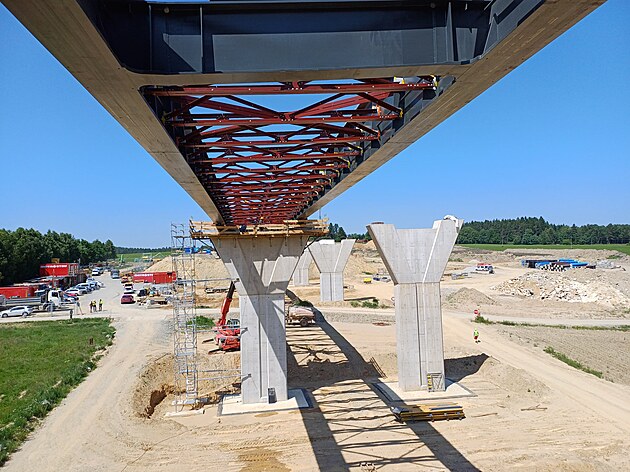 Ocelovou konstrukci estakády na dálnici D3 svařují na místě a postupně ji vysouvají přes betonové pilíře.
