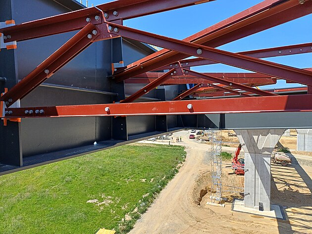 Ocelovou konstrukci estakády na dálnici D3 svařují na místě a postupně ji vysouvají přes betonové pilíře.