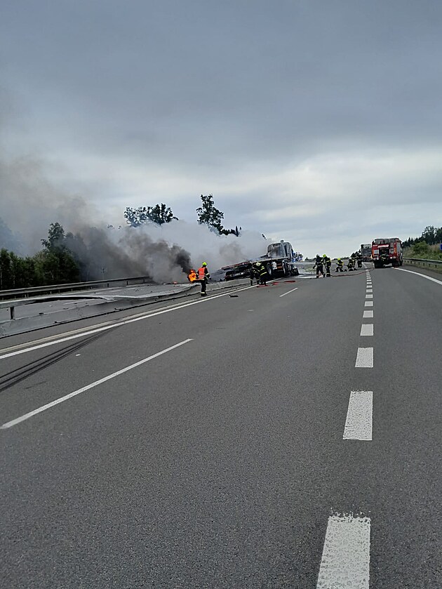 Kamion prorazil středová svodidla. (9. července 2025)