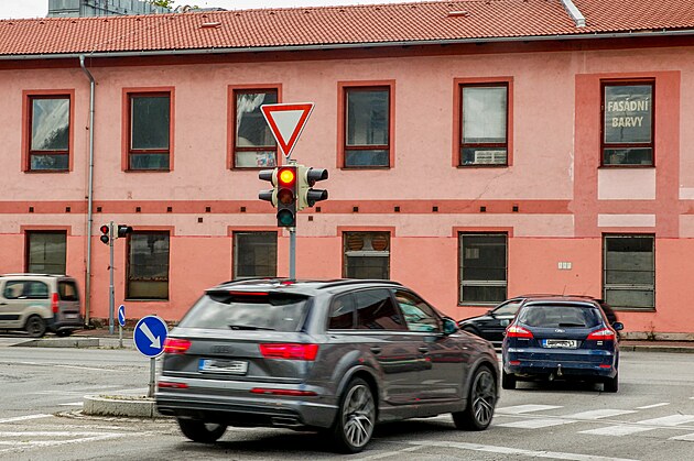 Křížení Mánesovy a B. Němcové. Z fotografie je patrné, že řidič audi už projíždí na červenou.