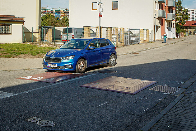 Zpomalovací polštáře nechala budějovická radnice nainstalovat v roce 2018 na téměř 70 místech po Pražském předměstí. Snímek je z ulice Jar. Haška.