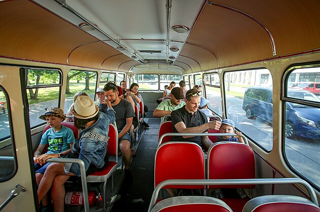 Červené koženkové sedačky, přesně jako před několika desetiletími.