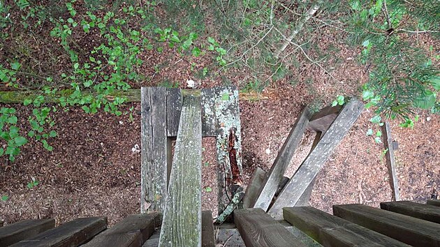 Vyhlídková věž je ze dřeva, na snímku je detail poškozeného trámu.