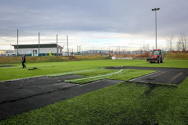 V tréninkovém areálu Složiště vyměňuje českobudějovické Dynamo část umělého povrchu na jednom z hřišť.