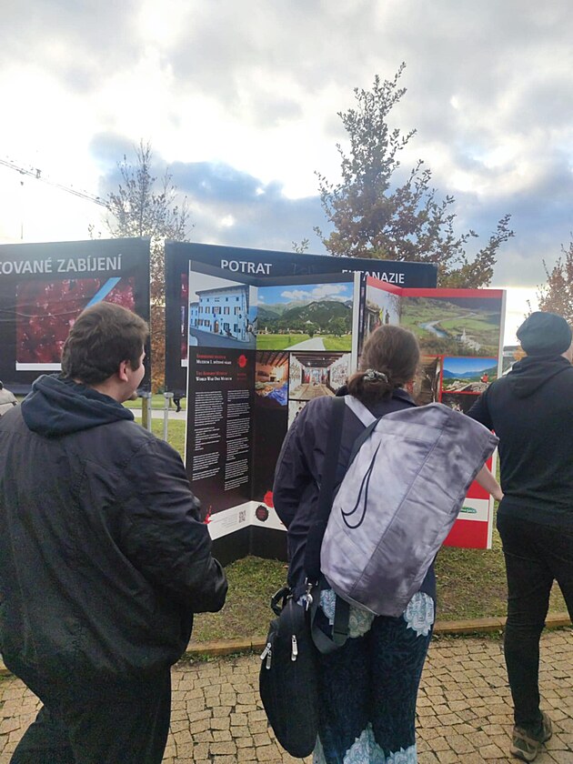 Spolek v kampusu univerzity postavil petiční stánek a bannery s fotografiemi z koncentračních táborů, s masovými hroby nebo zraněnými dětmi.