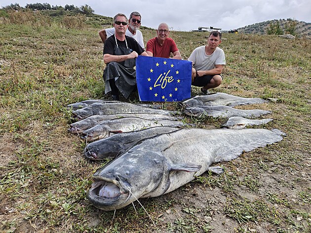 Tým odborníků z mezinárodního projektu Life Predator se vyfotil se sumci vylovenými z nádrže Iznájar.