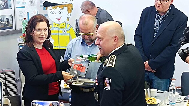 Knihu Budějovická mordparta pokřtili zleva primátorka Dagmar Škodová Parmová, jihočeský policejní mluvčí Jiří Matzner a šéf jihočeských policistů Luděk Procházka.