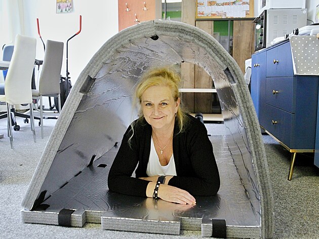 Hana Bauerová z Kontaktního centra Prevent v Prachaticích představuje speciální iglú pro lidi bez domova.
