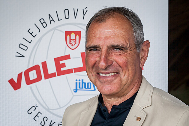 Jan Diviš pózuje před klubovým znakem při předsezonní tiskové konferenci v roce 2019.