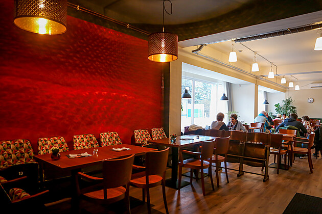 Kavárnu zdobí velké výlohy i staré sedačky z kina.