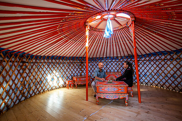 Buddhistická jurta je v Třeboni pod bývalou vodárenskou věží. Na snímku Milan Klečka se svou dcerou Anudar. (3. září 2025)
