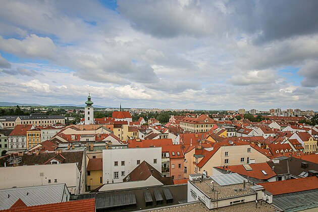 Pohled západním směrem na centrum města. Vlevo je budova Gymnázia Česká a napravo už zase vyčuhují paneláky Pražského sídliště.