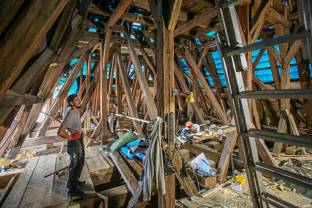 Navštívili jsme i krov nad presbytářem, kde tesaři vyměňují uhnilé části trámů.