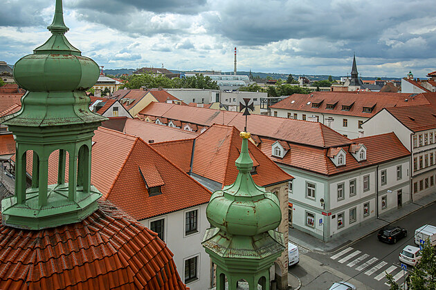 Sledujeme z lešení jihozápadní část Budějovic. Vzadu se tyčí teplárenský komín a dole pod námi je křižovatka ulic Kněžská a Kanovnická.