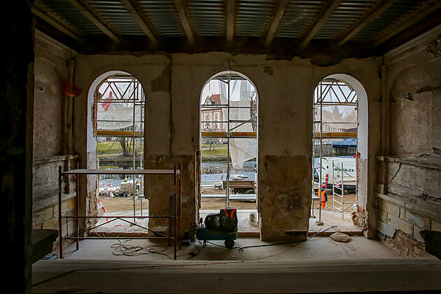 Pohled na hlavní vchod, řeku Malši a budovu soudu na druhém břehu.
