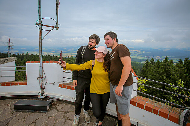 Turisté na vyhlídkové plošině nejstarší kamenné rozhledny v Česku – na Josefově věži na Kleti.