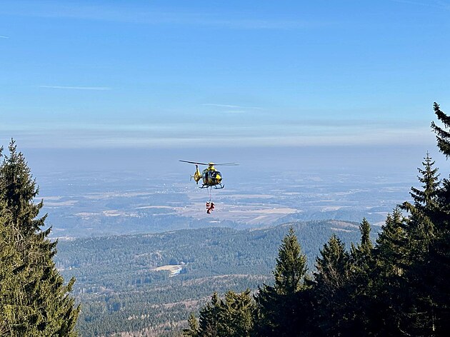 Lékařka a záchranář se ke zraněnému muži spustili z vrtulníku.