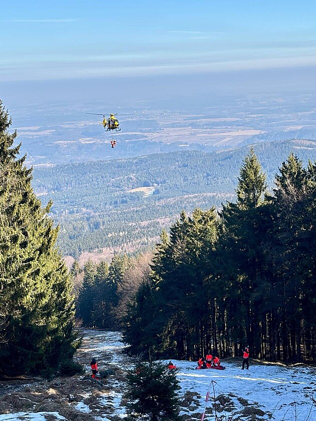 Záchranáři donesli zraněného muže na bývalou sjezdovku. Lékařka a záchranář se k nim spustili z vrtulníku.