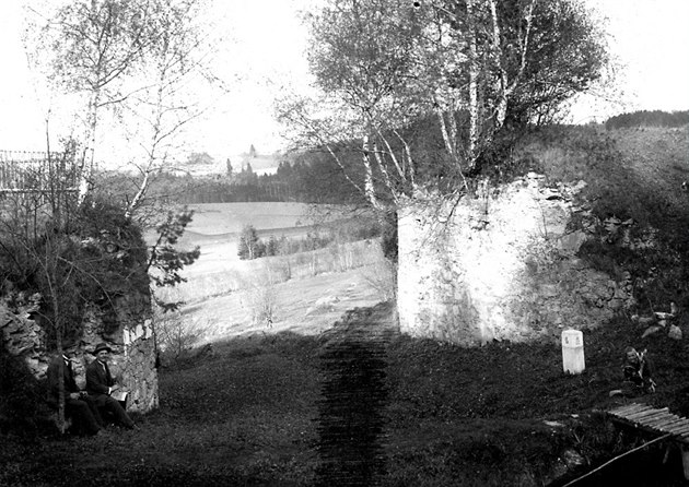 Opěry hraničního mostu mezi Čechami a Rakouskem na snímku z roku 1925, kdy se poprvé mapovaly pozůstatky koněspřežky. Archiv Iva Hajna GPS: 48.6228583N, 14.4505675E