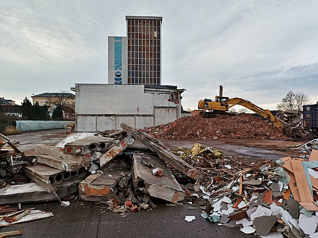 Vedle vysoké budovy stály garáže, které už těžká technika srovnala se zemí. (6. ledna 2024)