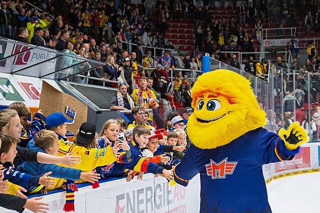 Nový maskot českobudějovických hokejistů z HC Motor baví v Budvar aréně především děti. (10. října 2025)