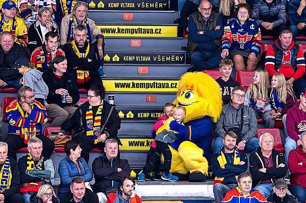 Nový maskot českobudějovických hokejistů z HC Motor baví v Budvar aréně především děti. (10. října 2025)