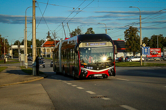Českobudějovický dopravní podnik (DP) testuje nové bateriové trolejbusy Škoda 33 Tr na náročné trase Rudolfov - Haklovy Dvory. Na snímku je vůz u českobudějovického výstaviště na Husově třídě. (13. září 2025)