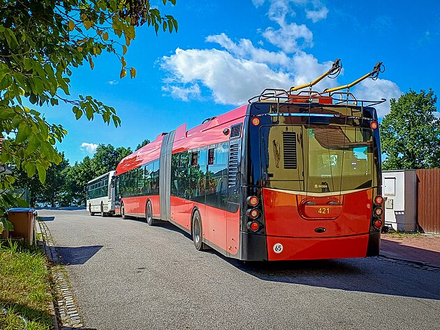 Českobudějovický dopravní podnik (DP) testuje nové bateriové trolejbusy Škoda 33 Tr na náročné trase Rudolfov - Haklovy Dvory. Na snímku je vůz na konečné v Haklových Dvorech. (13. září 2025)