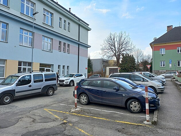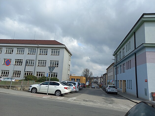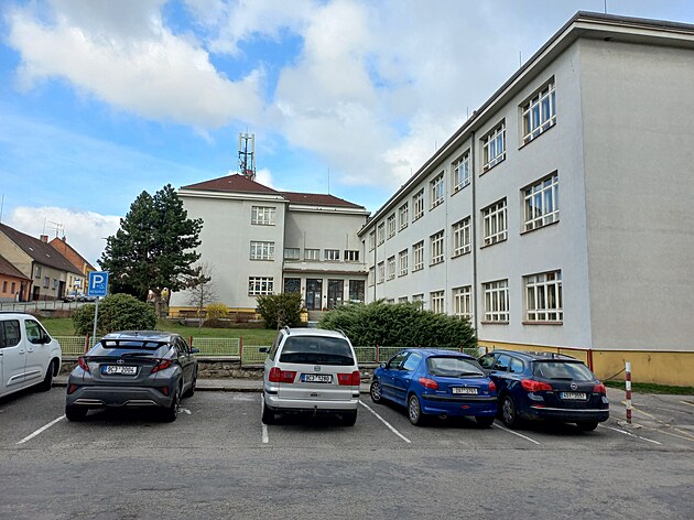 Prostor u milevské školy T. G. M. se plní auty před začátkem vyučování, pak už tam bývá většinou klid.