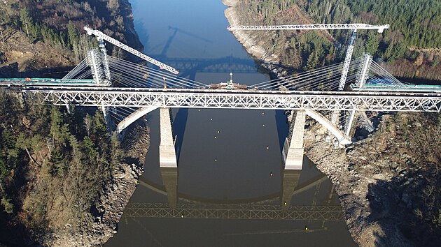 Vpředu starý, za ním nový. Po starém mostě už jezdí jen osobní vlaky, a to ještě sníženou rychlostí. (prosinec 2023)