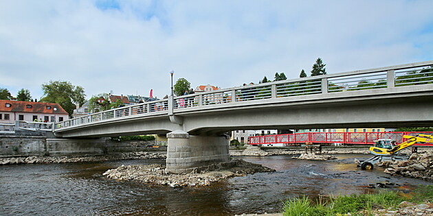 Když se most opravoval, pěším sloužila provizorní lávka. Ta je na fotografii ještě vidět, co nevidět ji ale dělníci rozeberou.