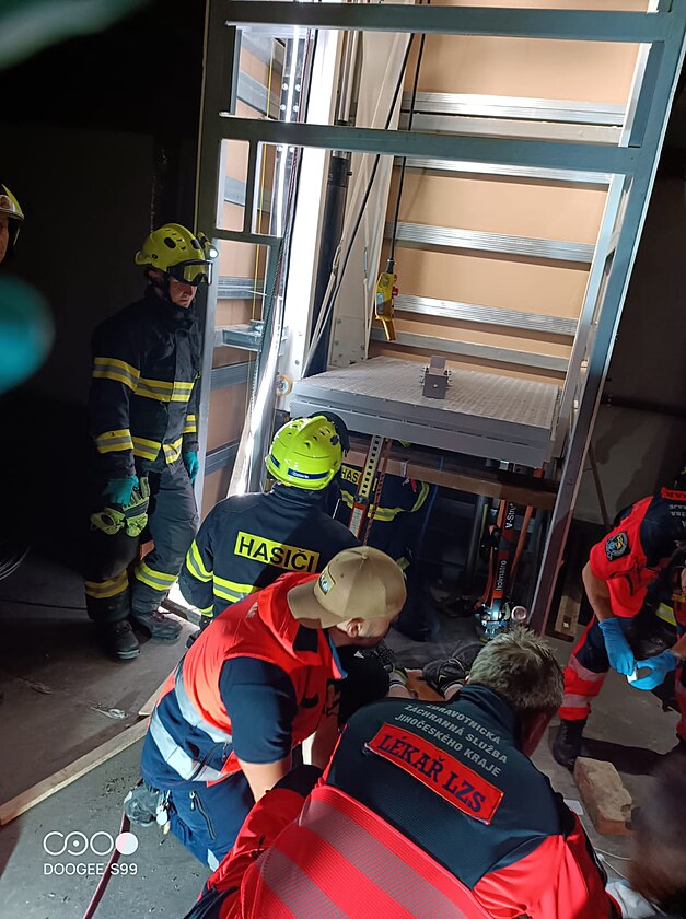 Hasiči a záchranáři spolupracovali při záchraně muže, na kterého v rekonstruovaném pivovaru v Jindřichově Hradci spadl výtah.