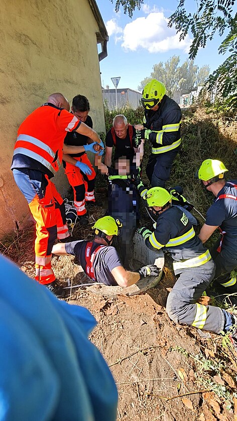 Zraněného muže vytáhli ze studny hasiči za pomoci záchranářů. (25. srpna 2025)