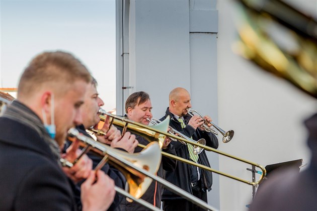 Hudebníci z orchestru Jihočeského divadla hrají každé úterý a čtvrtek ze střechy českobudějovické radnice.