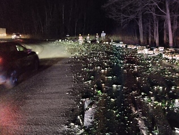 Řidič nákladního vozu vysypal přepravky s pivem na silnici v zatáčkách nad Pískem ve směru na Tábor. (17. prosince 2024)