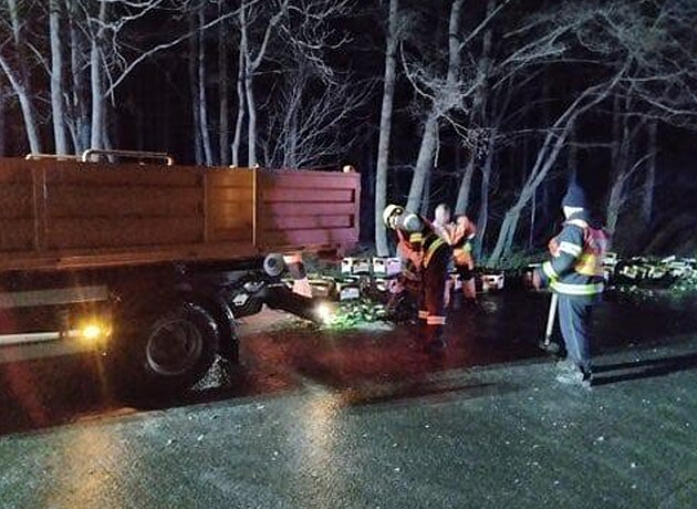 Řidič nákladního vozu vysypal přepravky s pivem na silnici v zatáčkách nad Pískem ve směru na Tábor. (17. prosince 2024)