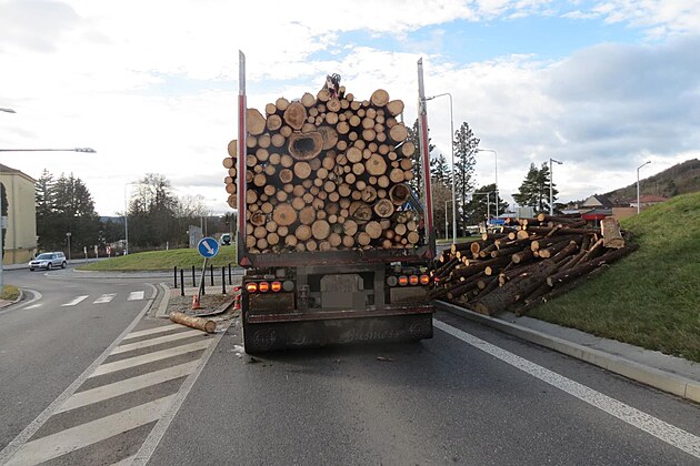 Ve Strakonicích se v pondělí z kamionu vysypaly klády. (16. prosince 2024)